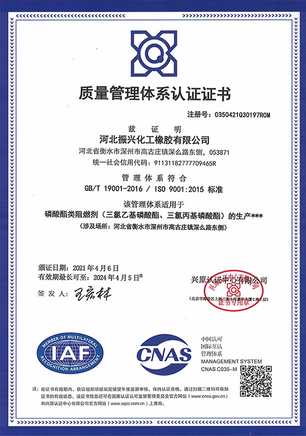 河北振興化工橡膠有限公司座落在河北省深州市高古莊鎮(zhèn)化工園區(qū)。公司始建于1990年,占地面積20000m2,建筑面積12000m2固定資產(chǎn)500多萬(wàn)元,現(xiàn)有員工135人,其中工程技術(shù)人員10多人。公司主要產(chǎn)品有磷酸三(2-氯乙基)酯(TCEP)、磷酸三(2-氯丙基)酯(TCPP)、三芳基磷酸酯(IPPP)、磷酸三乙酯(TEP)、磷酸三(2,3-二氯丙基)酯(TDCPP)等。公司擁有先進(jìn)的設(shè)備,嚴(yán)格的檢測(cè)標(biāo)準(zhǔn),完善的售后服務(wù),科學(xué)的質(zhì)量管理體系,專(zhuān)業(yè)打造較好的產(chǎn)品,公司擁有悠久的高品質(zhì)產(chǎn)品,產(chǎn)品設(shè)計(jì),制造,性能,質(zhì)量達(dá)到先進(jìn)水平。我們堅(jiān)持質(zhì)量求發(fā)展,本著誠(chéng)信贏得客戶的經(jīng)營(yíng)宗旨,與各界朋友真誠(chéng)合作,···